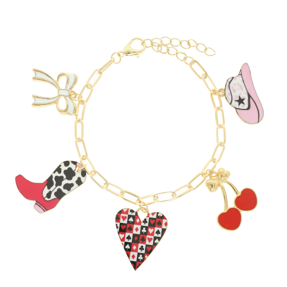 ENAMEL CHARM BRACELET FEATURES BOW, CHERRY, COWBOY BOOTS, HEART, AND HAT TRINKET