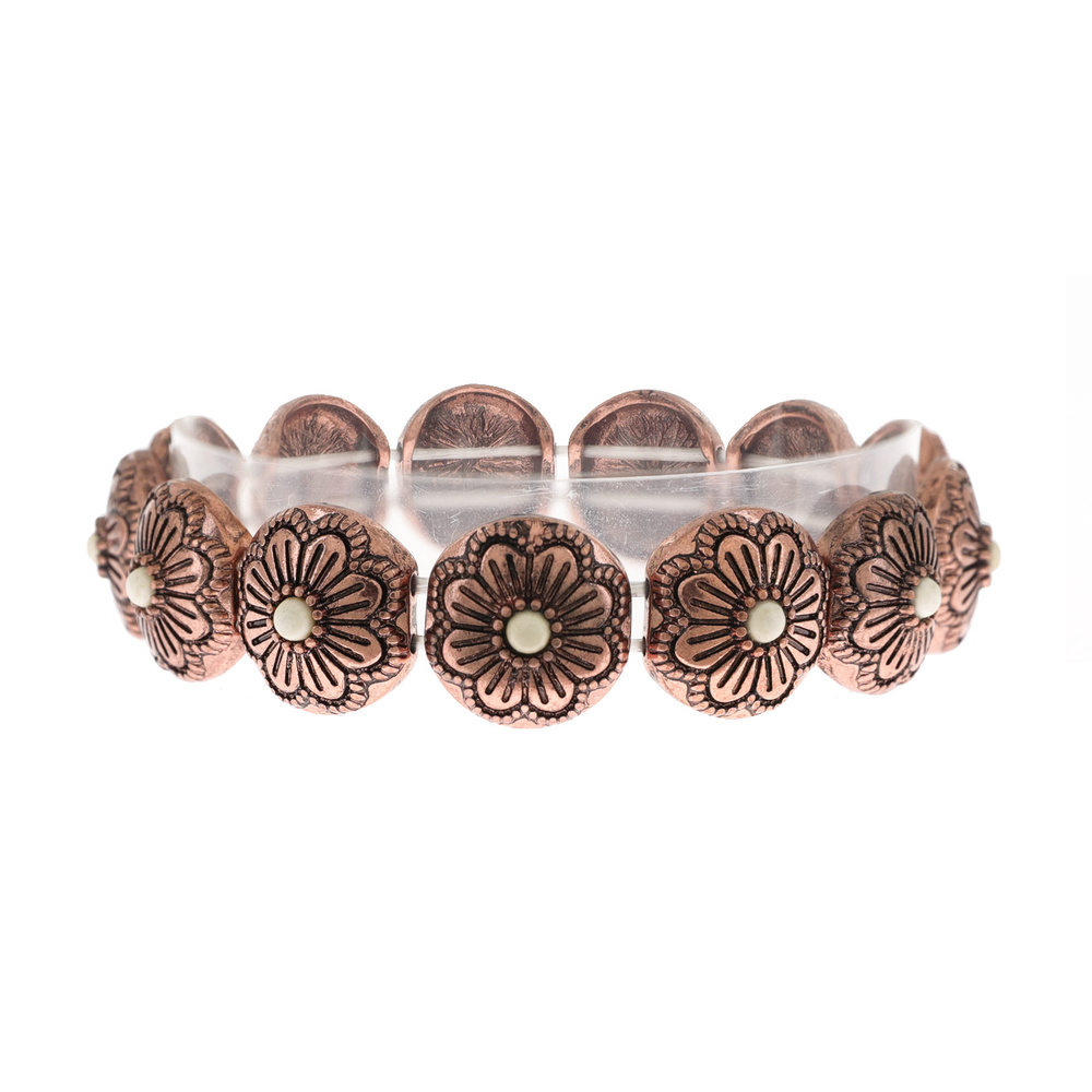 WESTERN SEMI STONE TURQUOISE FLOWER CONCHO STRETCH BANGLE BRACELET IN SILVER AND COPPER OXIDIZED METAL