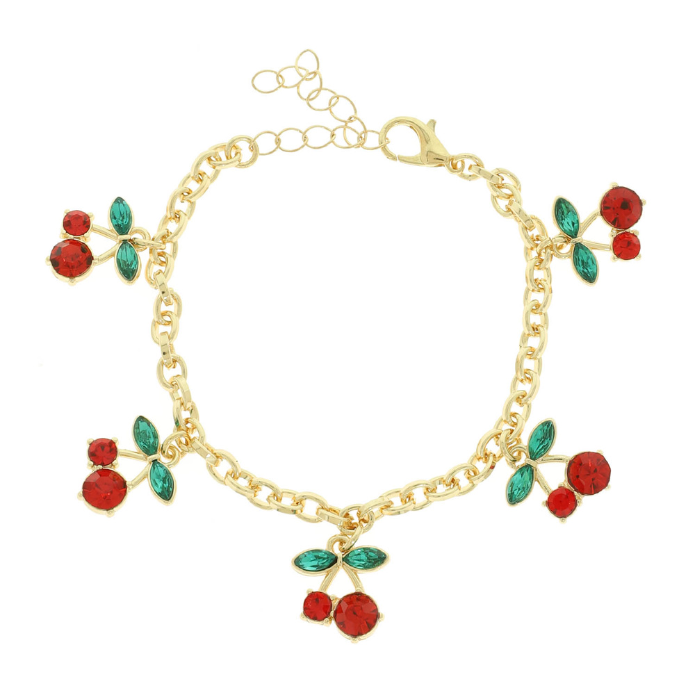 RED AND GREEN CRYSTAL EMBELLISHED CHERRY CHARM BRACELET