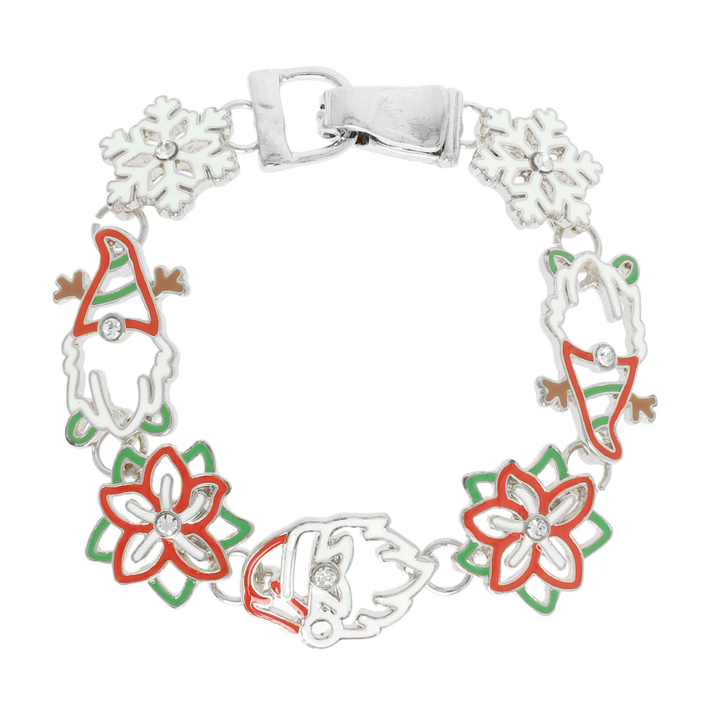 CHRISTMAS THEME ENAMEL CHARM BRACELET WITH MAGNETIC CLASP FEATURING SNOWFLAKE AND POINSETTIA DESIGNS