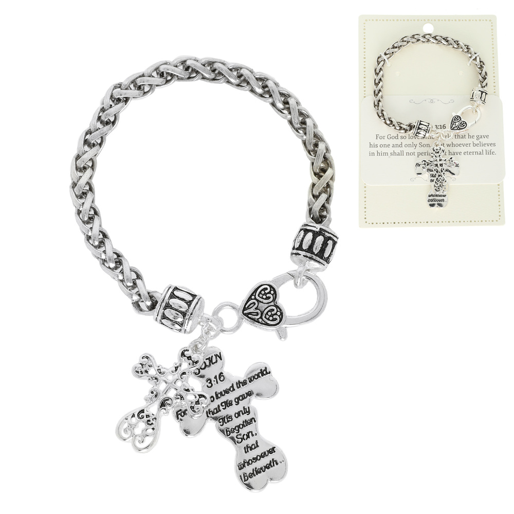 JOHN 3:16 BIBLE VERSE INSCRIBED FILIGREE CROSS CHARM WHEAT CHAIN BRACELET