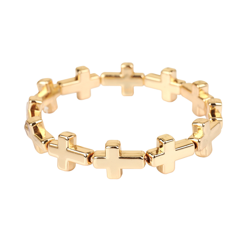 POLISHED METALLIC LATIN CROSS BEAD STRETCH BRACELET IN GOLD-TONE METAL