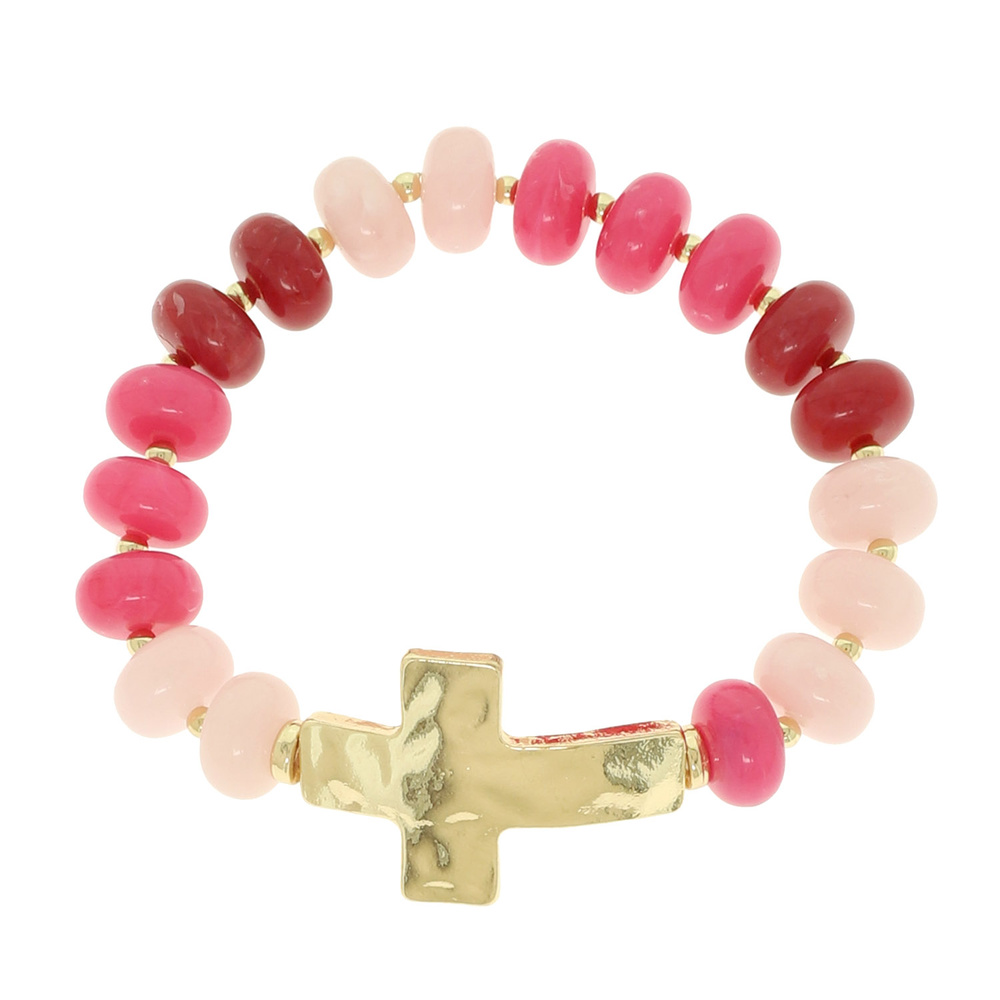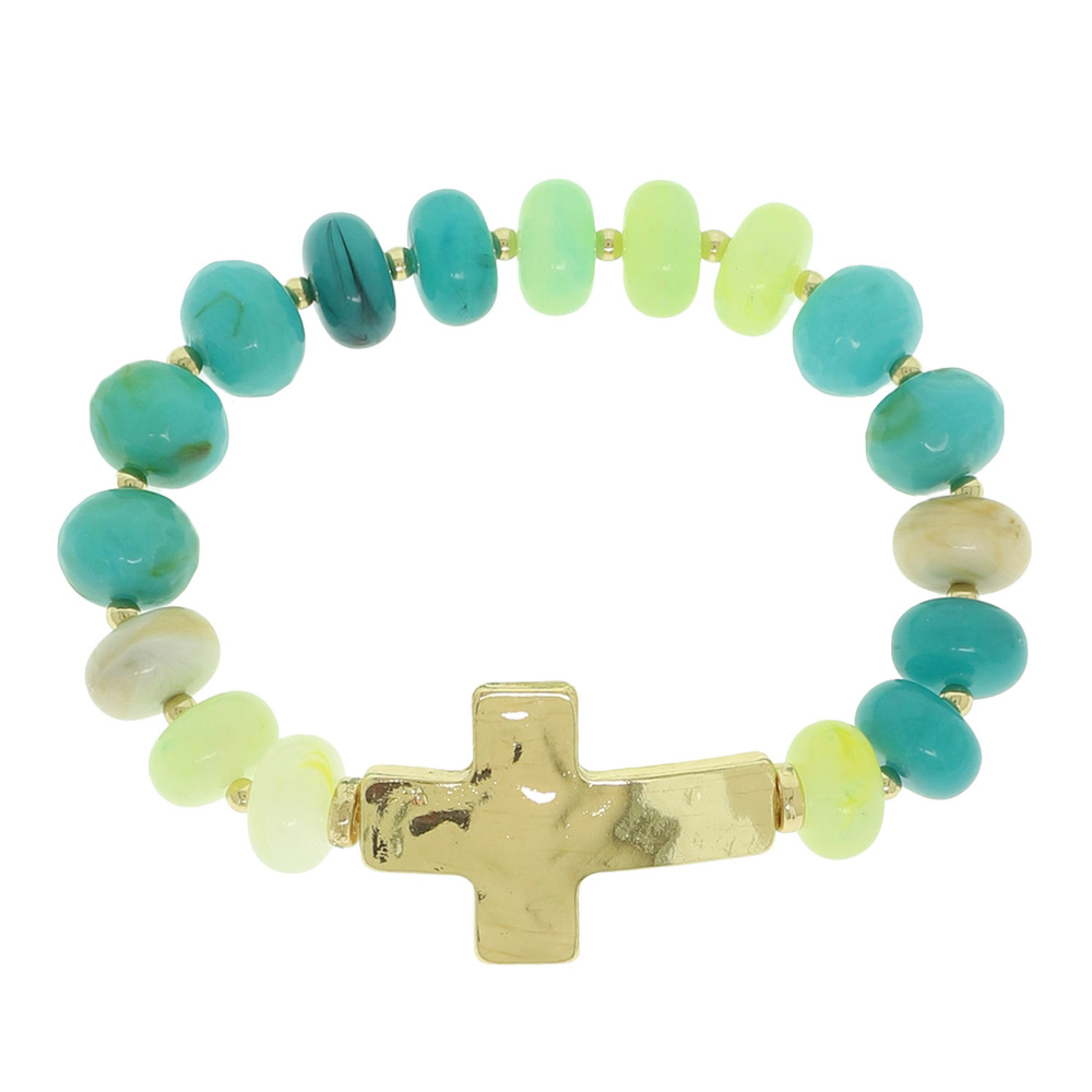 MULTI COLOR MARBLED GLASS BEAD STRETCH BRACELET WITH GOLD TONE CROSS CHARM