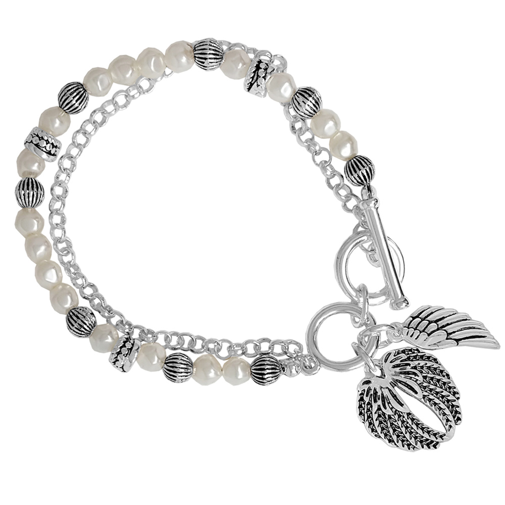 Multi Bead Pearl 2 Row Toggle Wing Charm Bracelet