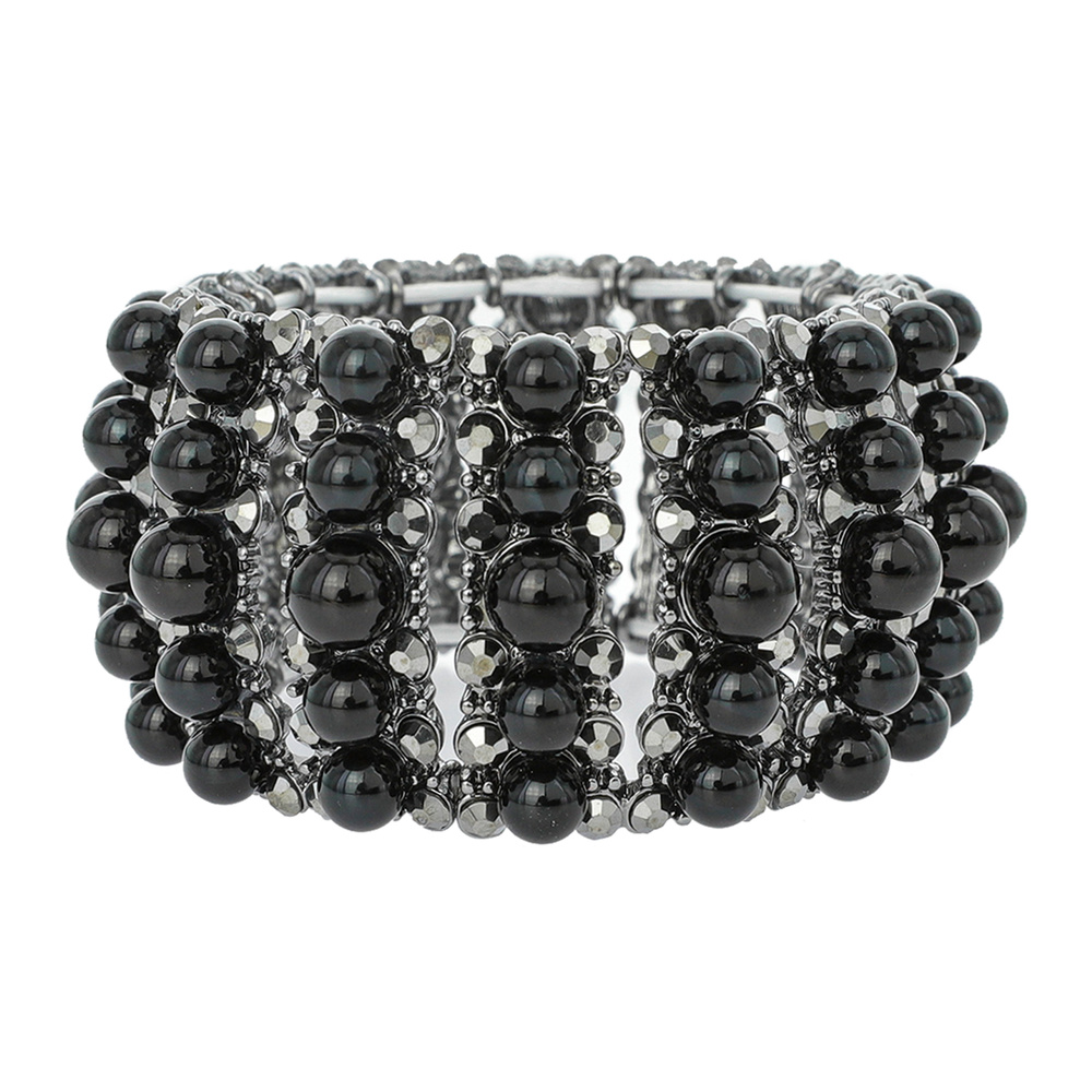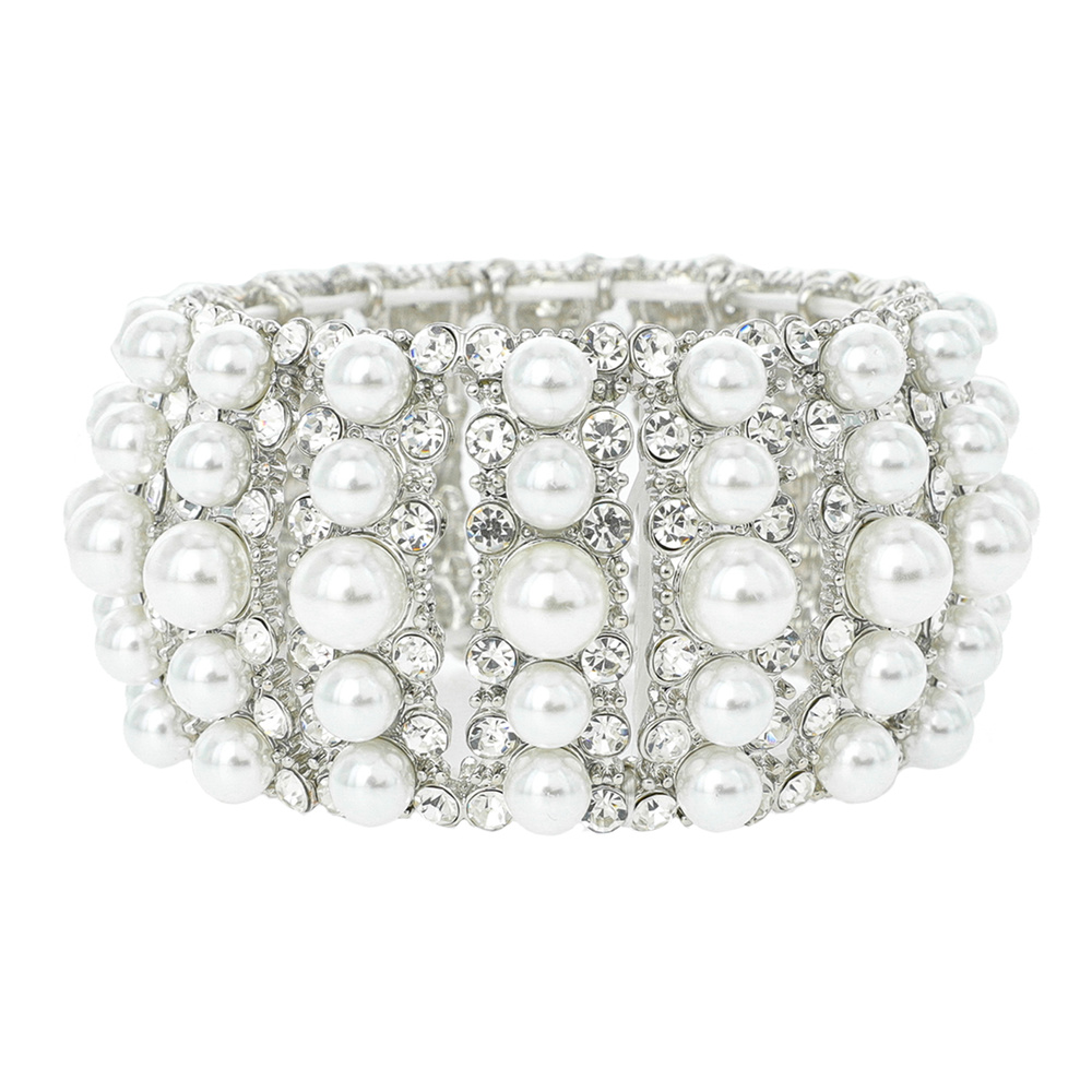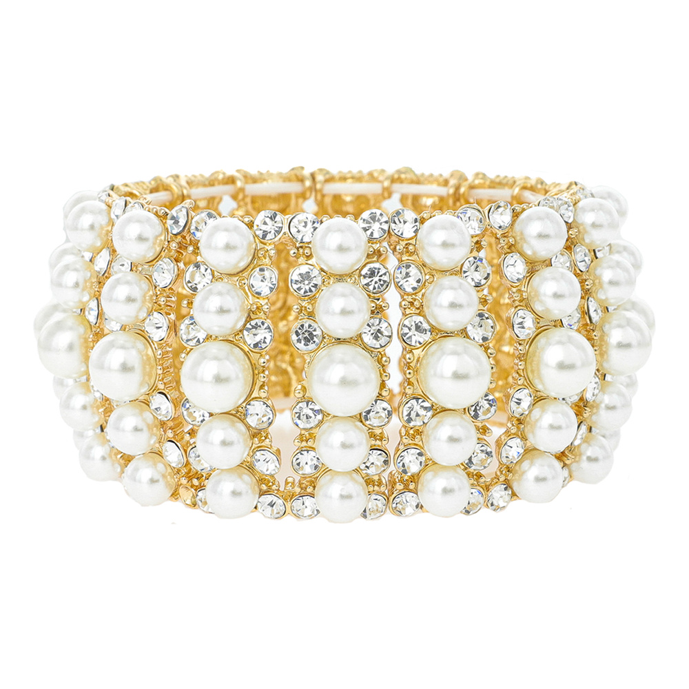 PEARL RHINESTONE CIRCLE AND RECTANGLE METAL STRETCH EVENING BRACELET