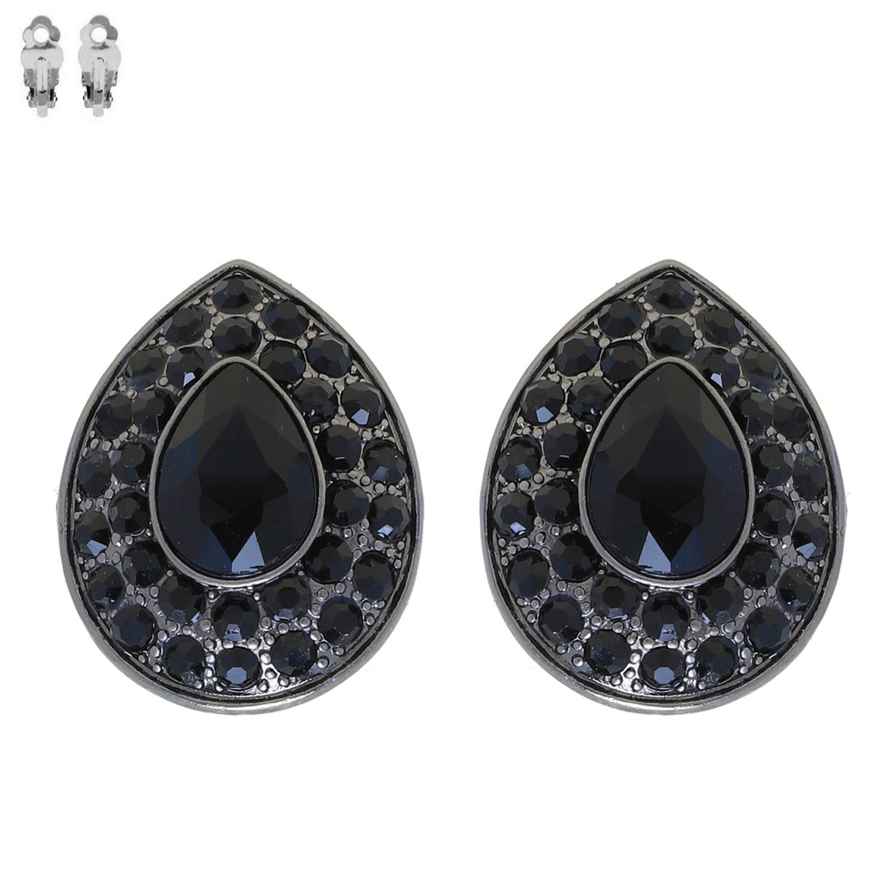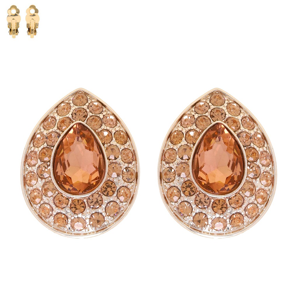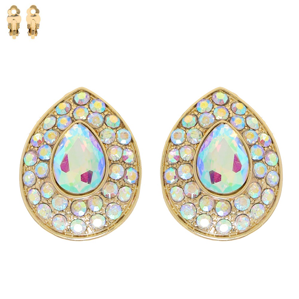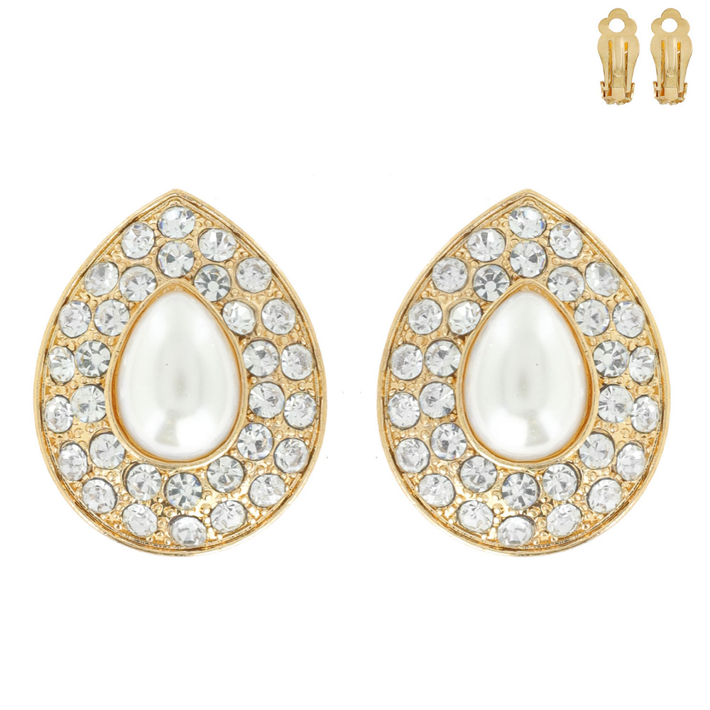 Stones with Center Pearl Upside Down Teardrop Metal Clip Earrings