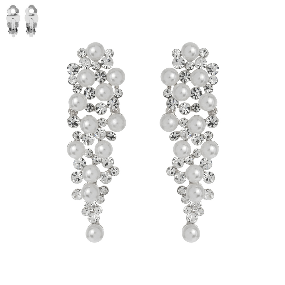 RHINESTONE & SYNTHETIC PEARL CLUSTER LONG DROP CLIP ON EARRINGS