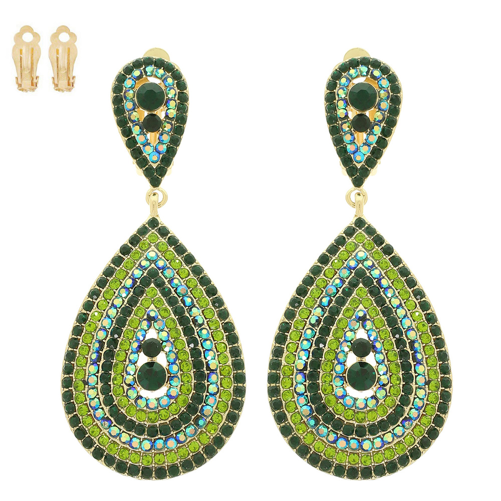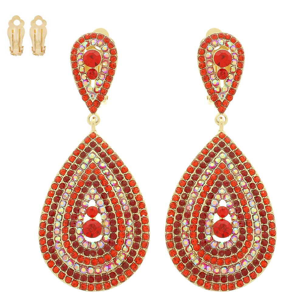 CRYSTAL RHINESTONE PAVE TEARDROP SHAPED DANGLE CLIP-ON EARRINGS