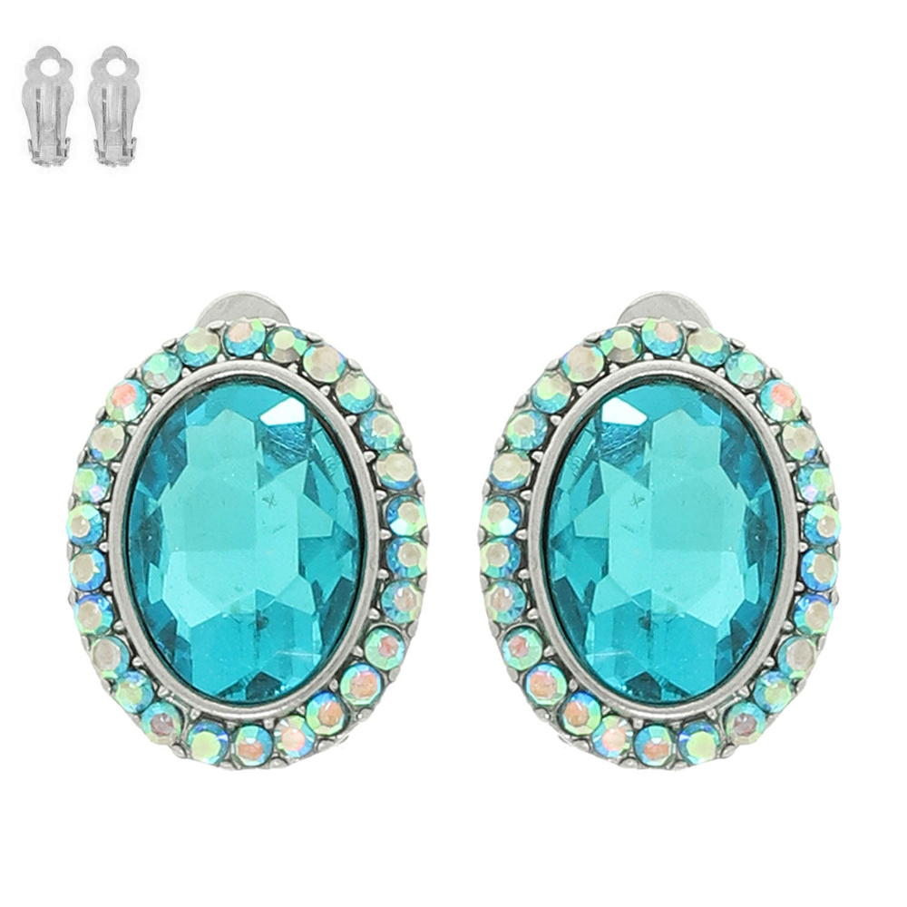 RHINESTONE HALO OVAL CUT CRYSTAL CLIP-ON STUD EARRINGS IN SILVER-TONE METAL