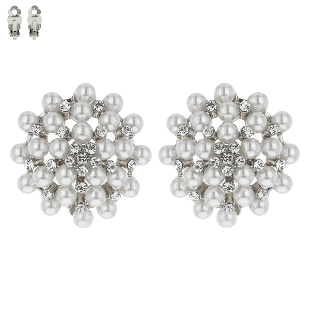 CRYSTAL RHINESTONE AND SYNTHETIC PEARL FLORAL CLUSTER CLIP ON EARRINGS