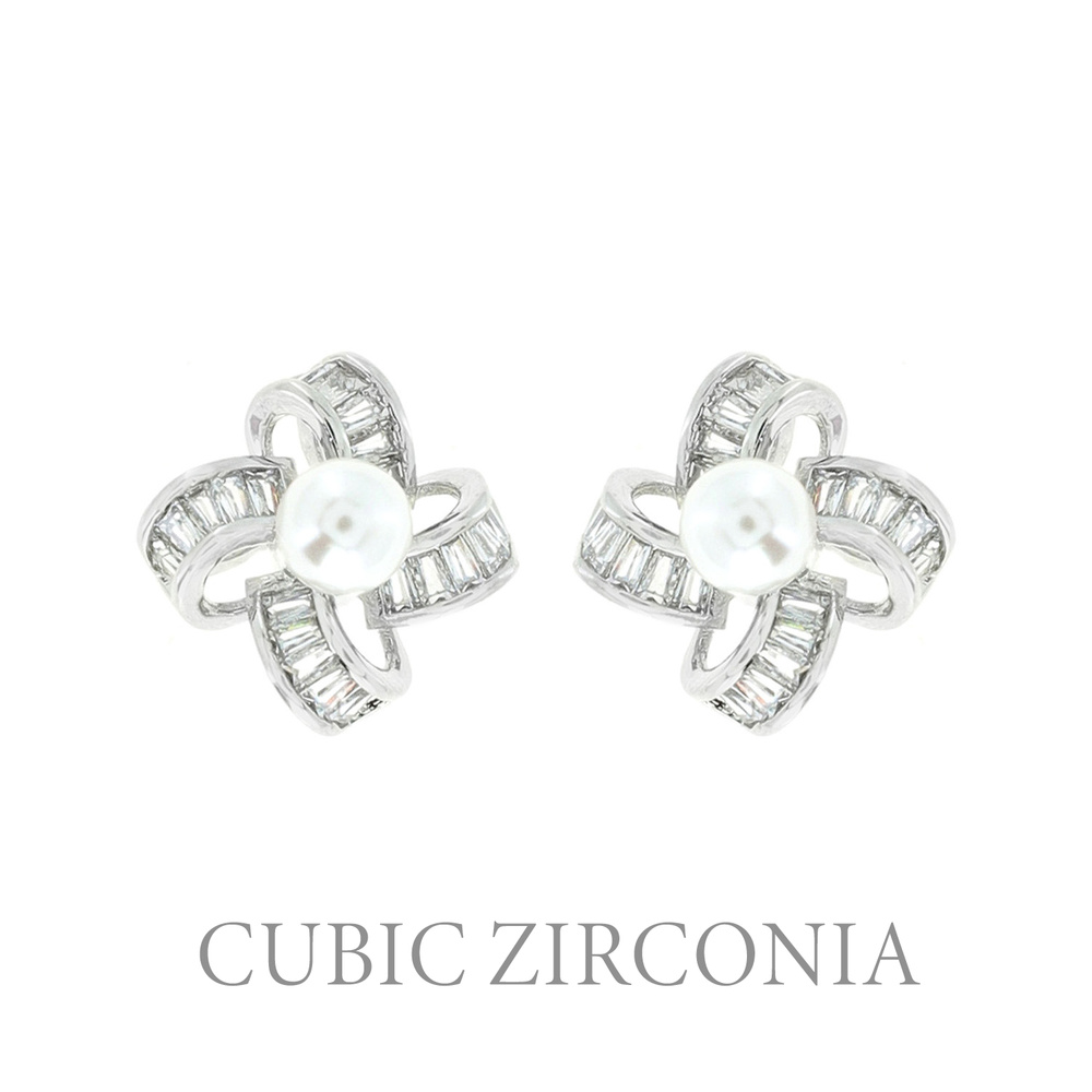 PEARL AND CZ CUBIC ZIRCONIA FLOWER STUD EARRINGS