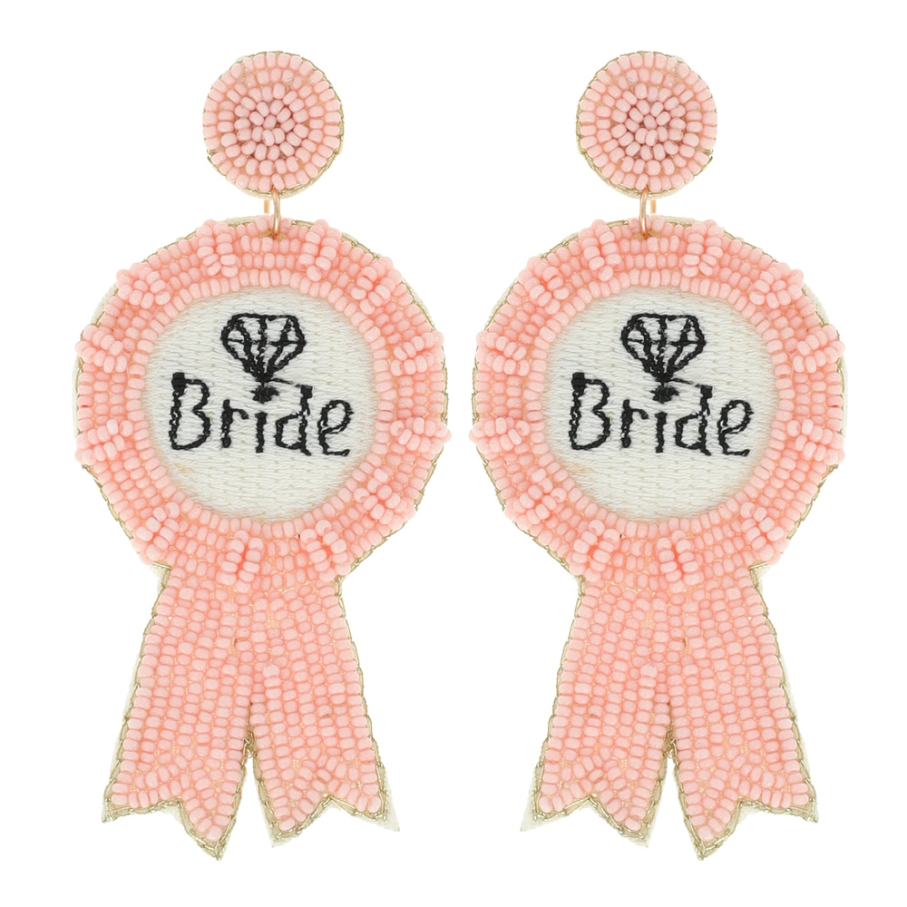 BRIDE SEED BEAD EMBELLISHED RIBBON DROP EARRINGS - BACHELORETTE PARTY HEN PARTY BRIDE TO BE JEWELRY