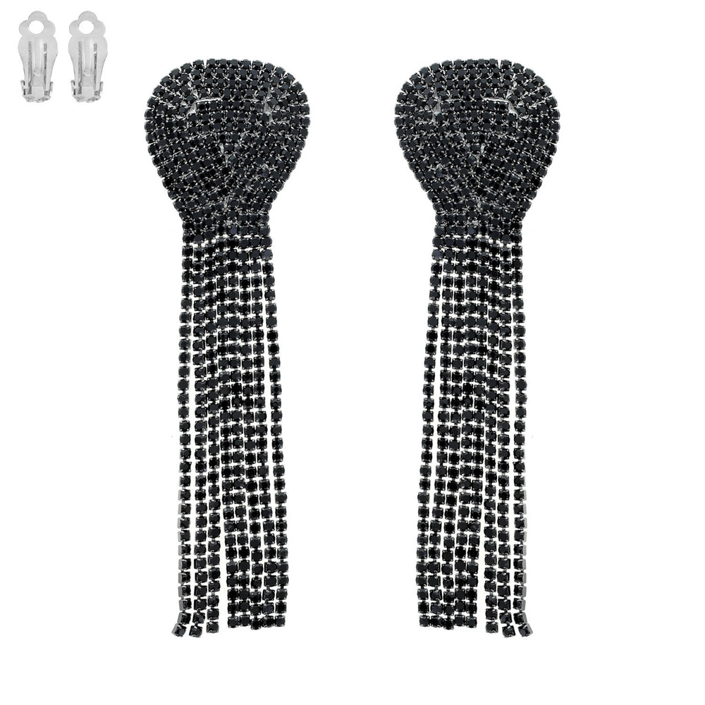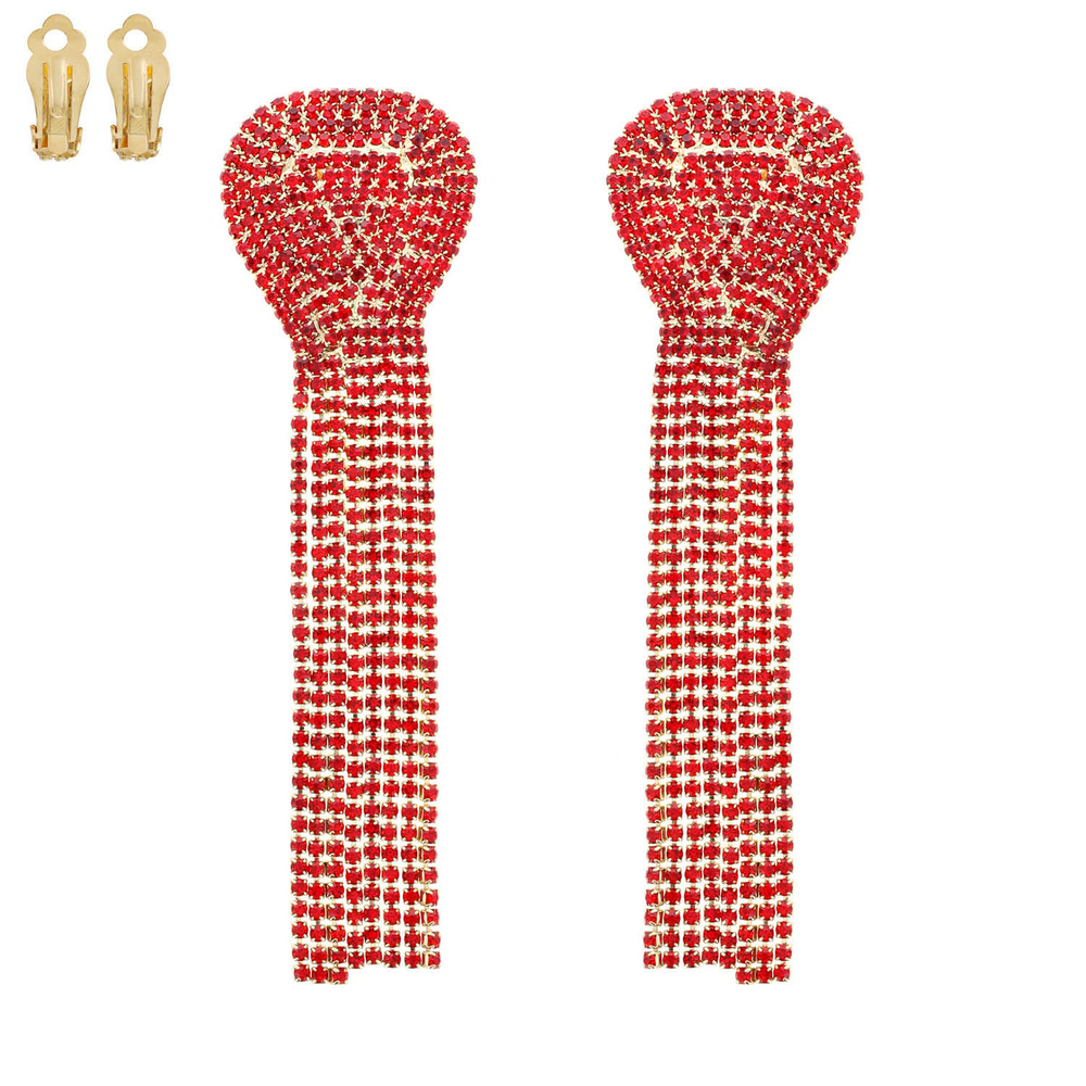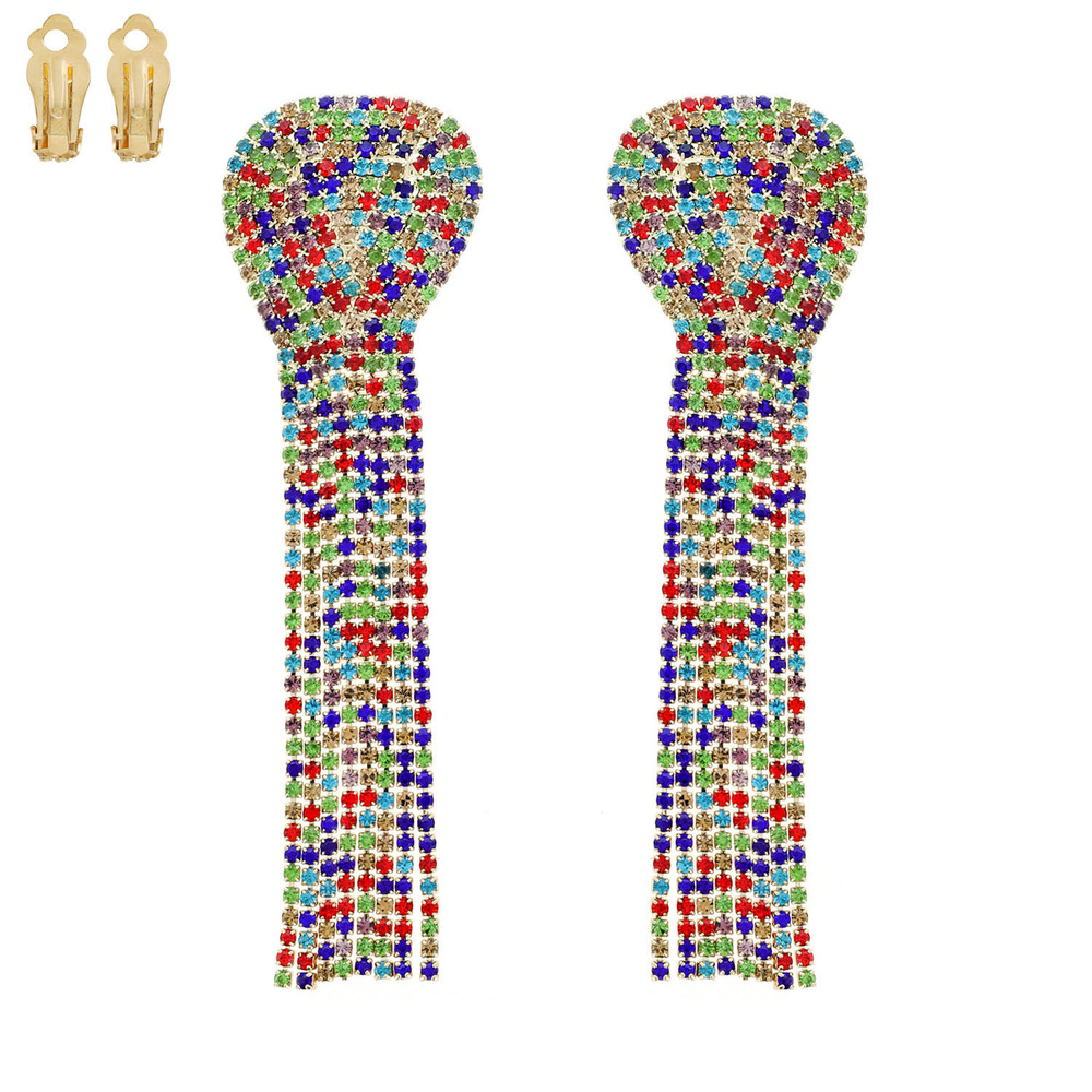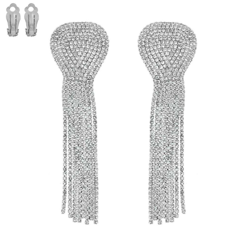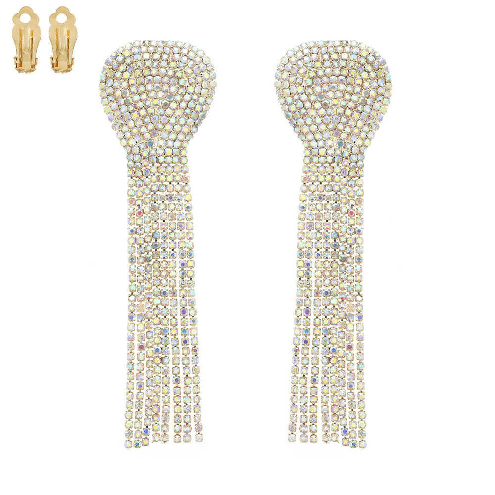 STATEMENT CRYSTAL RHINESTONE TASSEL CLIP ON LONG DROP EARRINGS