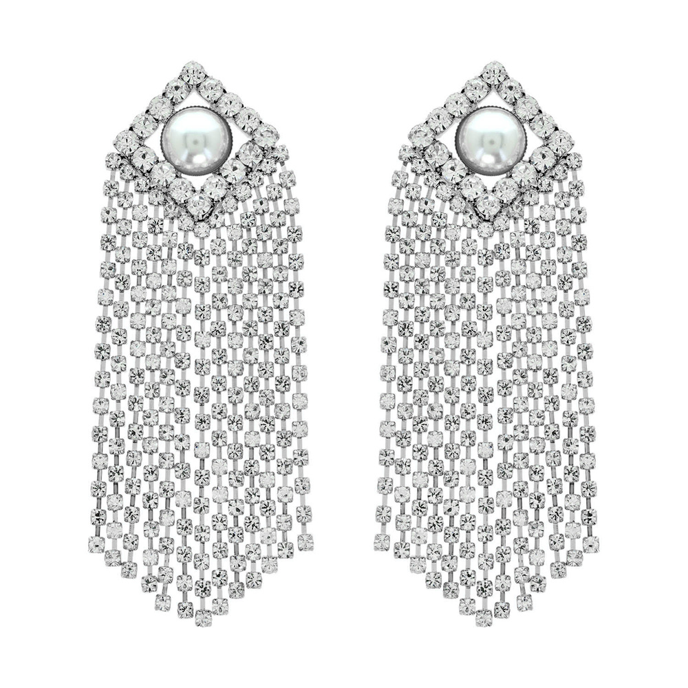 DRESSY ELEGANT OCCASION PEARL AND CRYSTAL RHINESTONE DANGLE FRINGE EARRINGS