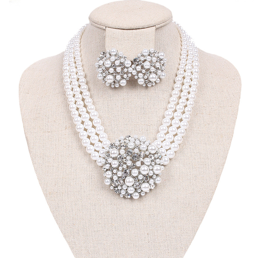 PEARL CRYSTAL MIX BRIDAL BROOCH MULTI STRAND ADJUSTABLE PRINCESS NECKLACE EARRING SET
