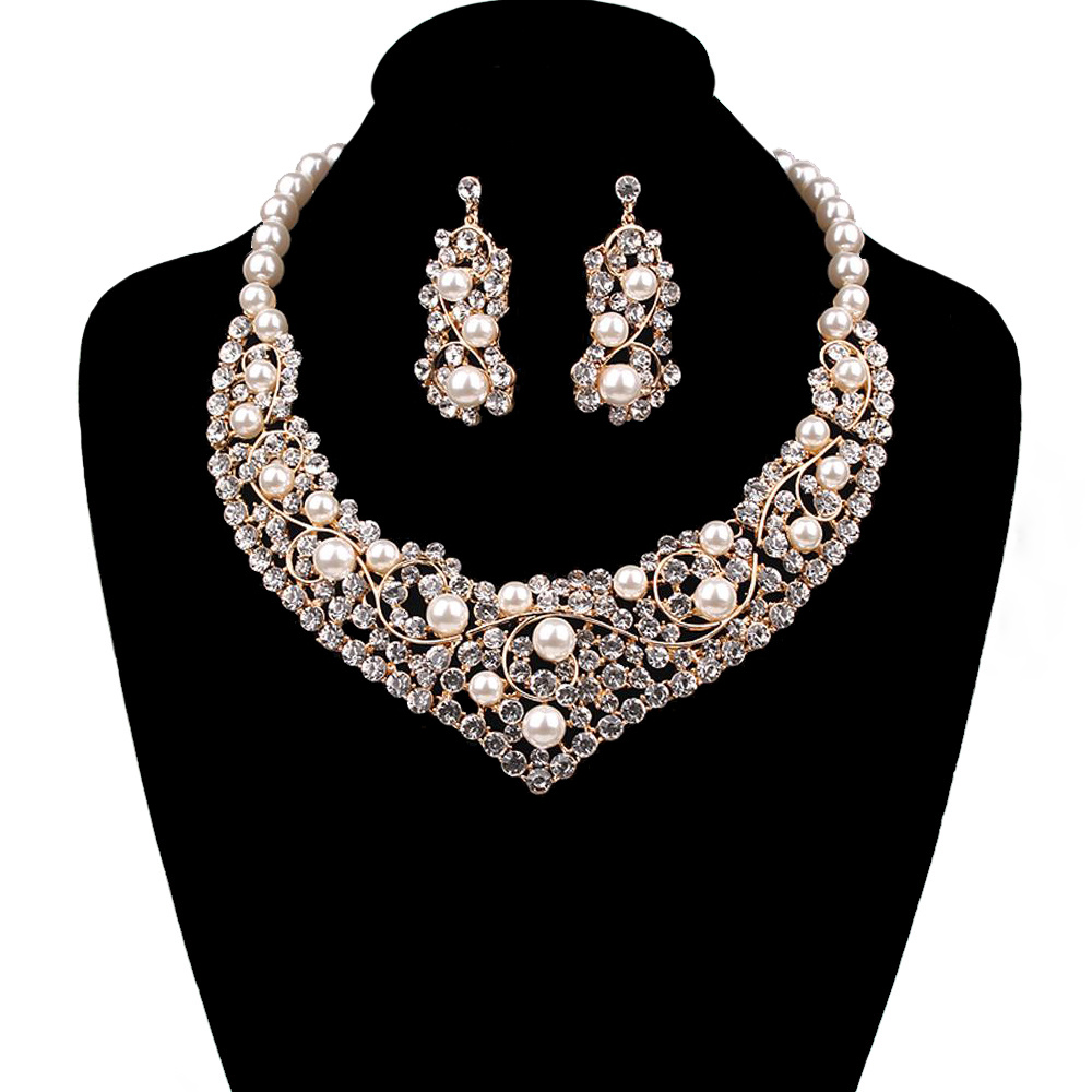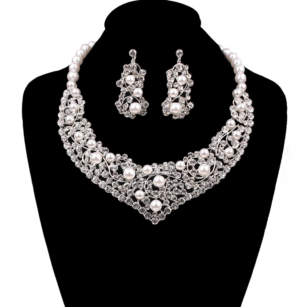Stone And Pearl V Necklace And Earrings Set Nbq10Rwh Dressy Pearl Necklace