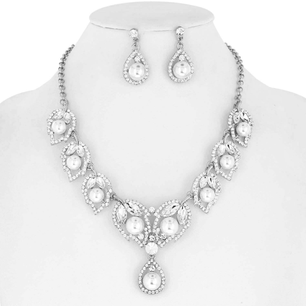 CRYSTAL RHINESTONE WITH PEARL LEAF V SHAPE COLLAR EVENING NECKLACE AND EARRINGS SET