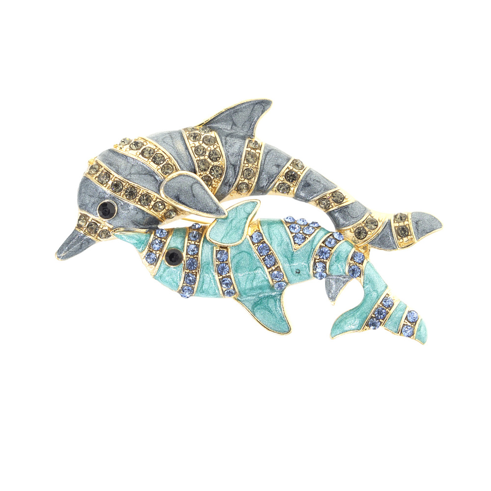 Rhinestone Pave Enamel Dolphins Brooch Pin