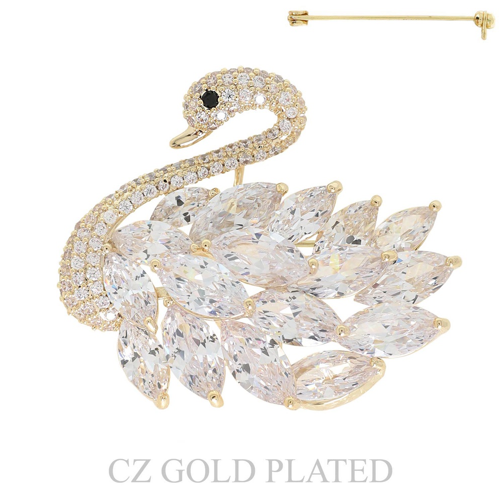 SWAN GOLD PLATED CUBIC ZIRCONIA BROOCH PIN IN YELLOW GOLD AND WHITE GOLD PLATTING