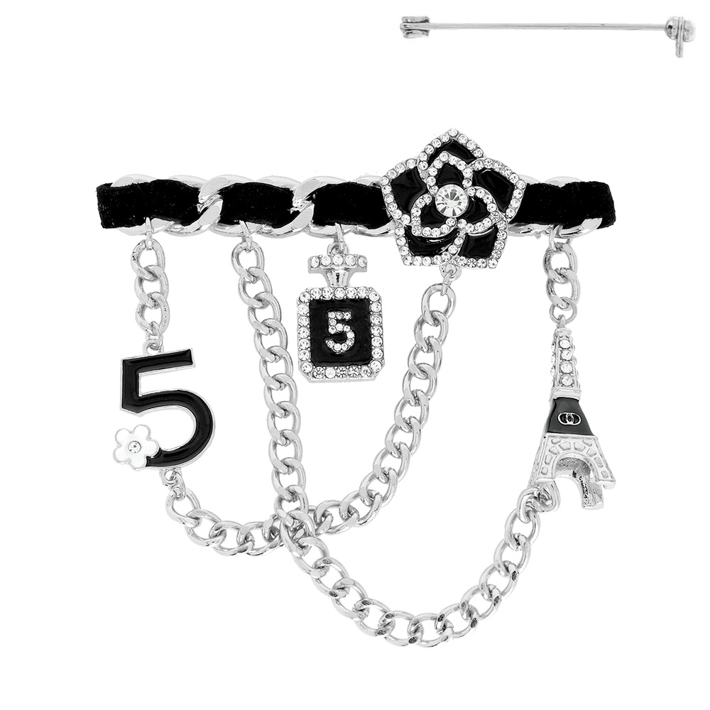 ICONIC FASHIONISTA MULTI CHARM ENAMEL COATED CRYSTAL RHINESTONE EMBELLISHED PAVE DECORATIVE TWO-TONE BROOCH WITH DANGLING CURB LINK