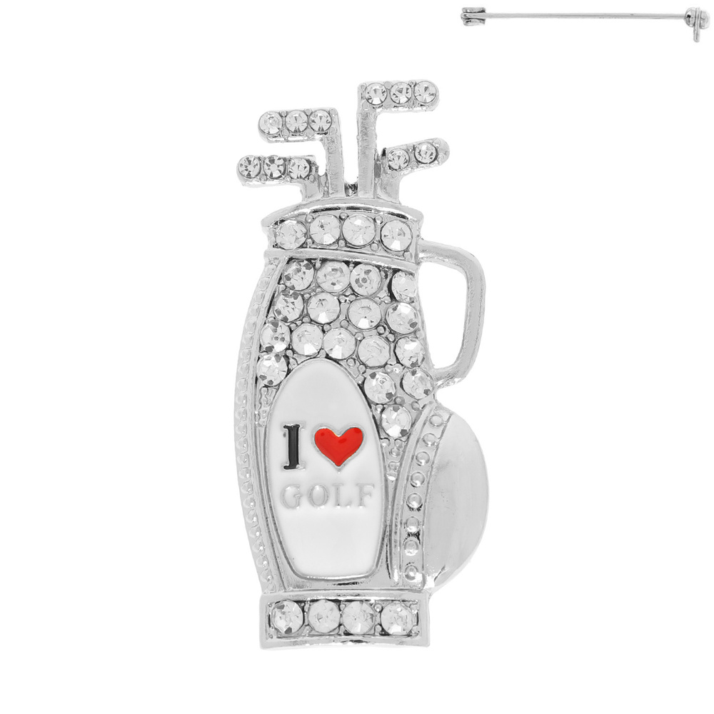 SPORTS THEMED RHINESTONE PAVE "I LOVE GOLF" (GOLF) BAG BROOCH PIN