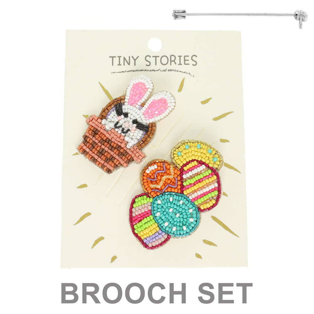 2 PIECE SEED BEAD EMBELLISHED EASTER EGG AND BUNNY BROOCH PIN SET