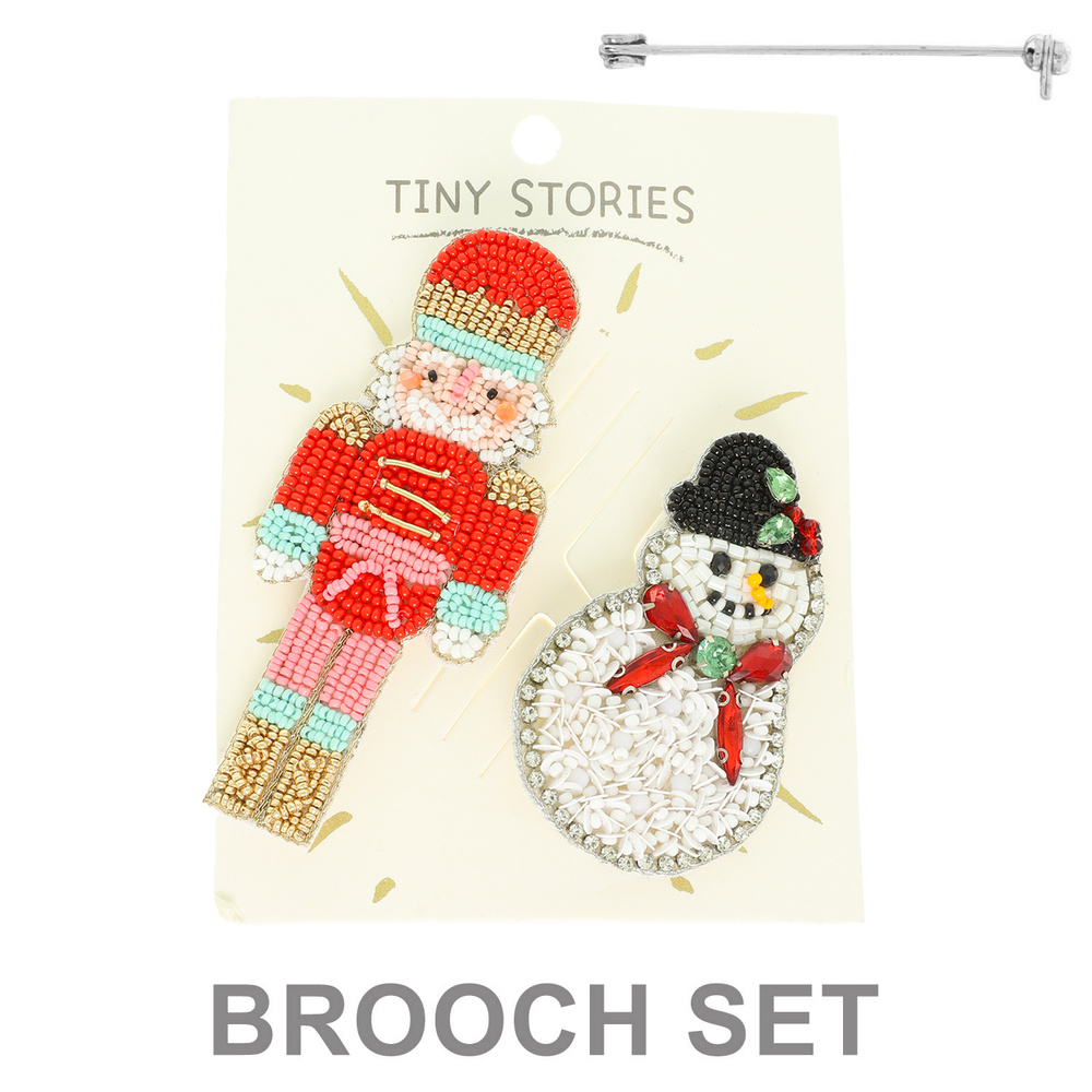 2 PIECE CRYSTAL BEAD EMBELLISHED SNOWMAN AND NUTCRACKER BROOCH PIN SET