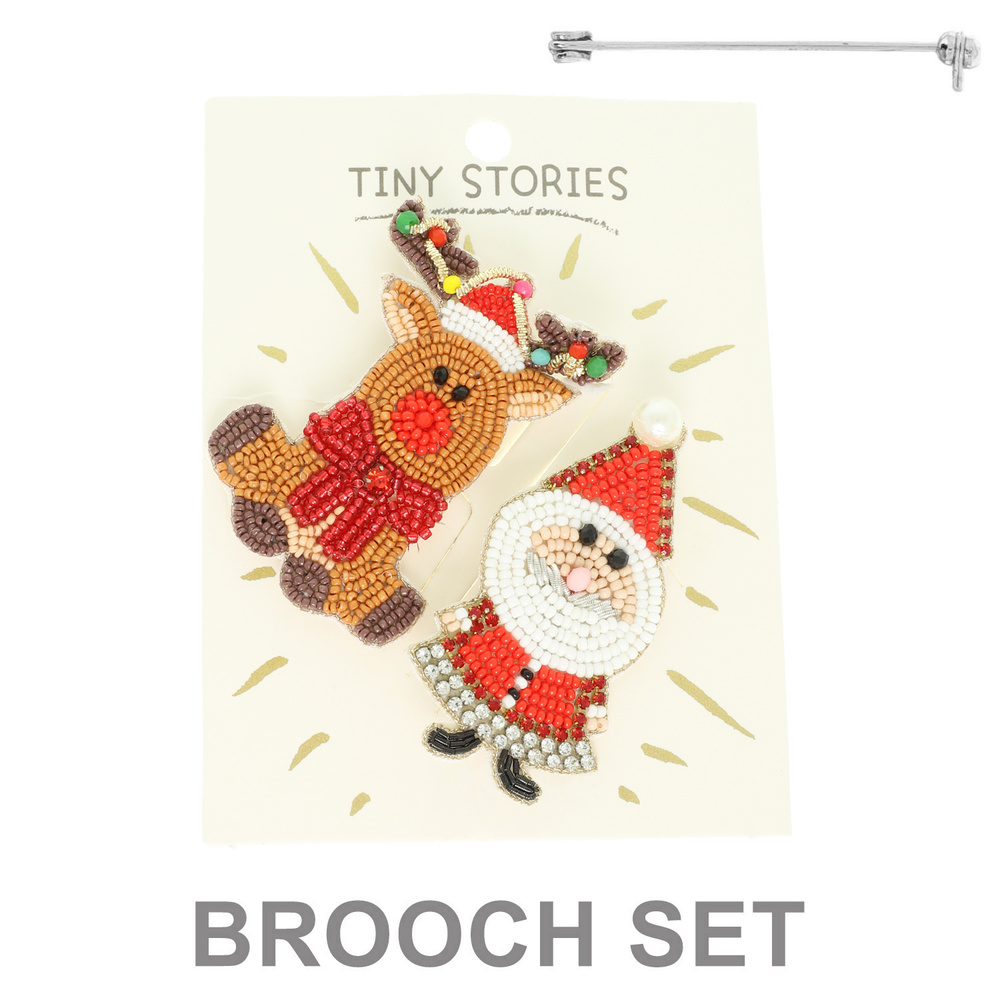2 PIECE CRYSTAL BEAD EMBELLISHED SANTA CLAUS AND REINDEER BROOCH PIN SET