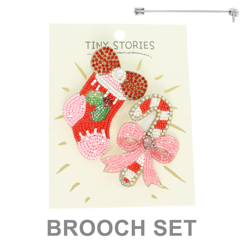 2 PIECE CRYSTAL BEAD EMBELLISHED STOCKING AND CANDY CANE BROOCH PIN SET