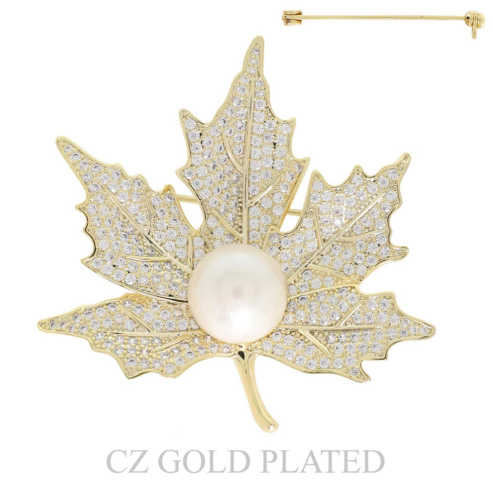 MAPLE LEAF GOLD PLATED CUBIC ZIRCONIA AND PEARL BROOCH PIN IN YELLOW GOLD AND WHITE GOLD PLATTING