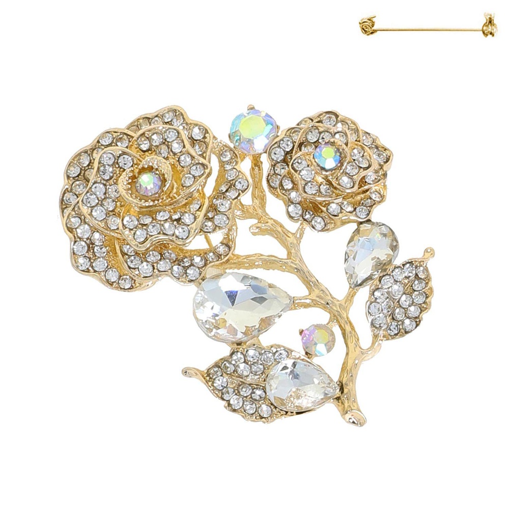 CRYSTAL RHINESTONE ROSE BUSH BROOCH PIN