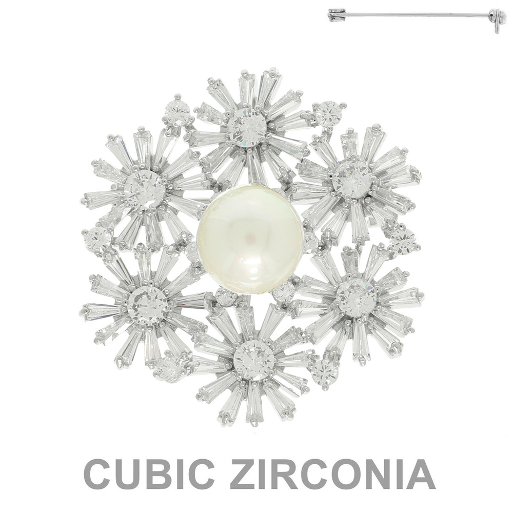 MULTI-CUT CUBIC ZIRCONIA PEARL EMBELLISHED FLOWER BUD BROOCH PIN