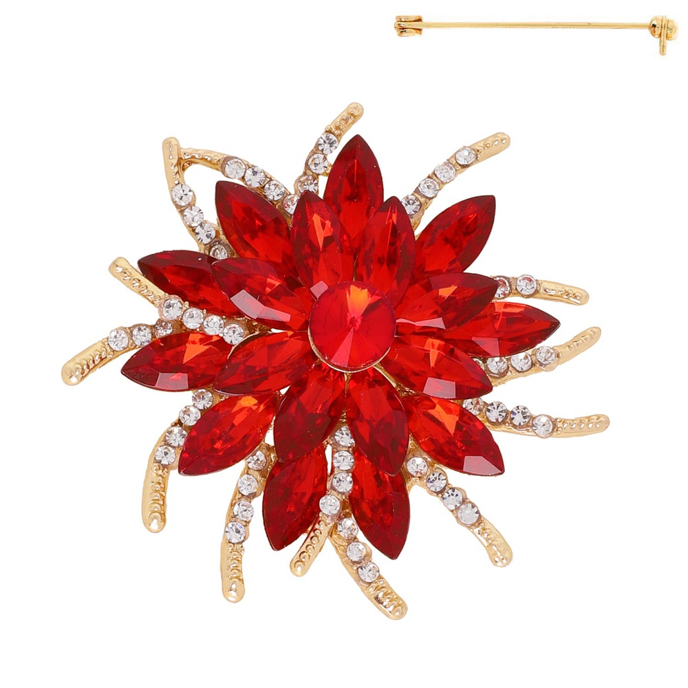 VINTAGE CRYSTAL GEMSTONE PETAL CUT JEWELED FLORAL BROOCH PIN IN GOLD TONE METAL