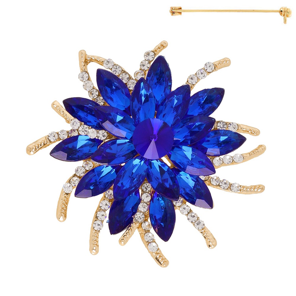 VINTAGE CRYSTAL GEMSTONE PETAL CUT JEWELED FLORAL BROOCH PIN IN GOLD TONE METAL