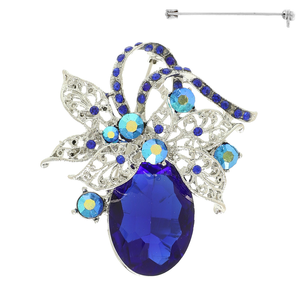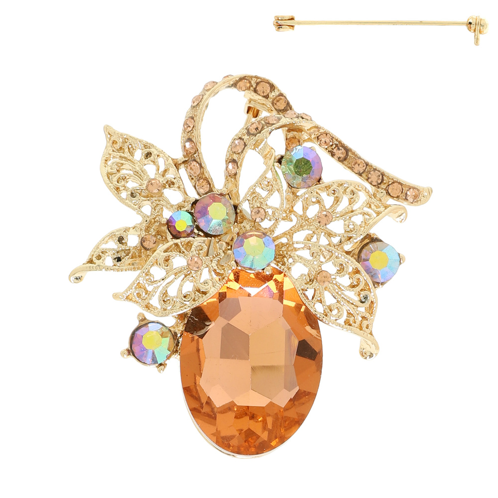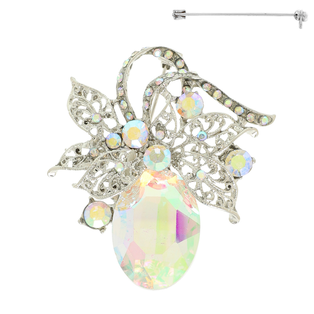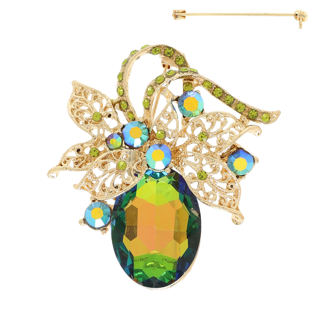 RHINESTONE PAVE OVAL CUT CRYSTAL FILIGREE LEAF CLUSTER BROOCH PIN