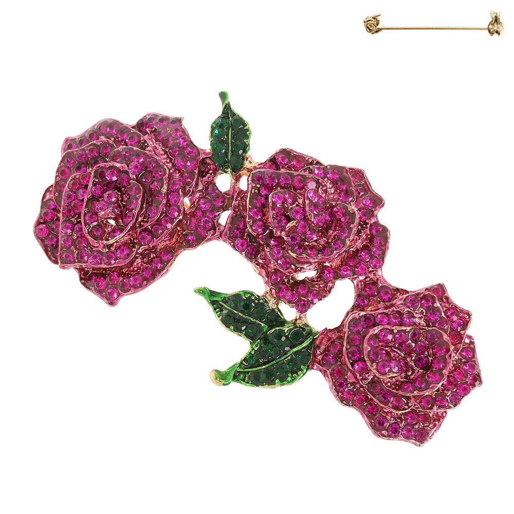 CAMELLIA FLOWER BROOCH PIN WITH CRYSTAL STONES AND LEAF DETAIL