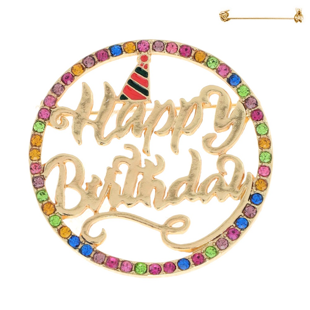 HAPPY BIRTHDAY, BIRTHDAY HAT CIRCULAR CRYSTAL RHINESTONE OPEN CIRCLE BROOCH PIN