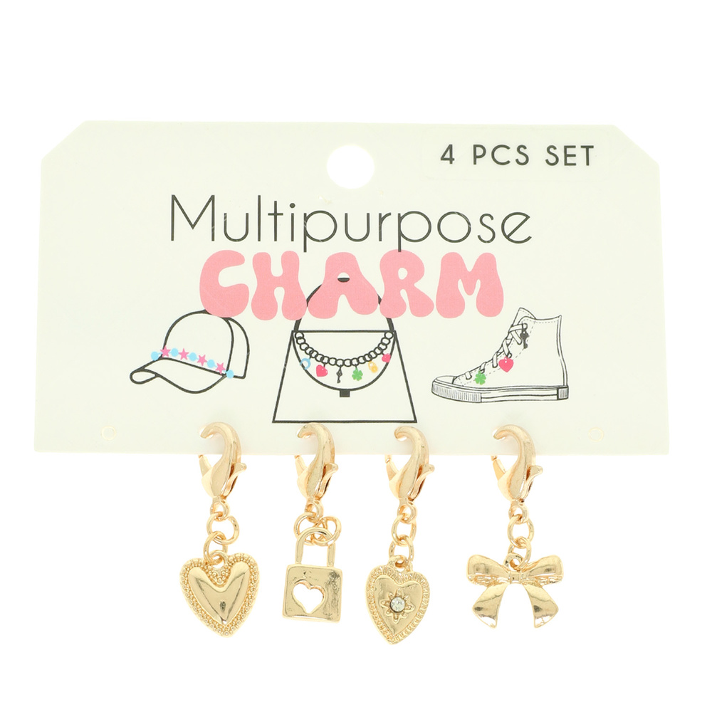 4 PIECE CHARM SET FEATURING BOW AND HEART TRINKETS IN GOLD TONE METAL FOR HATS SHOES AND NECKLACE USE