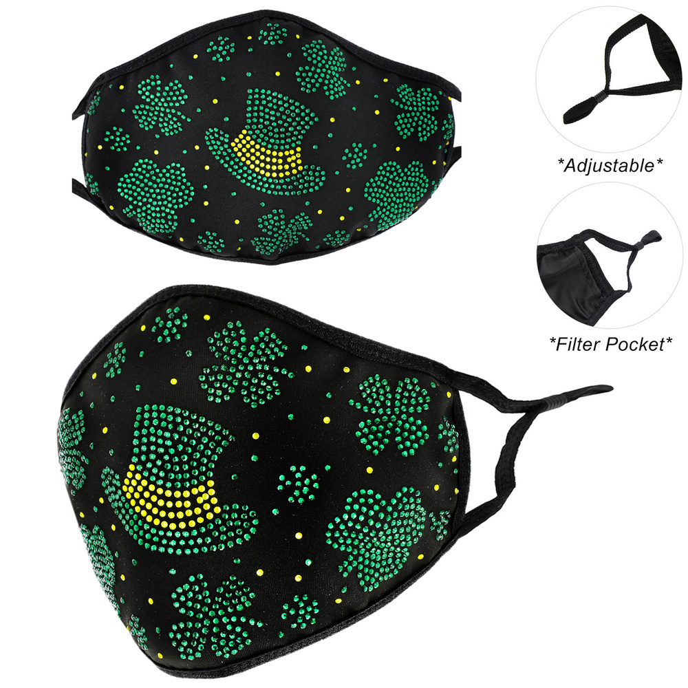 St Patricks Day Clover Rhinestone Bling Mask W/ Filter Pocket & Adjustable Elastic Ear Strap
