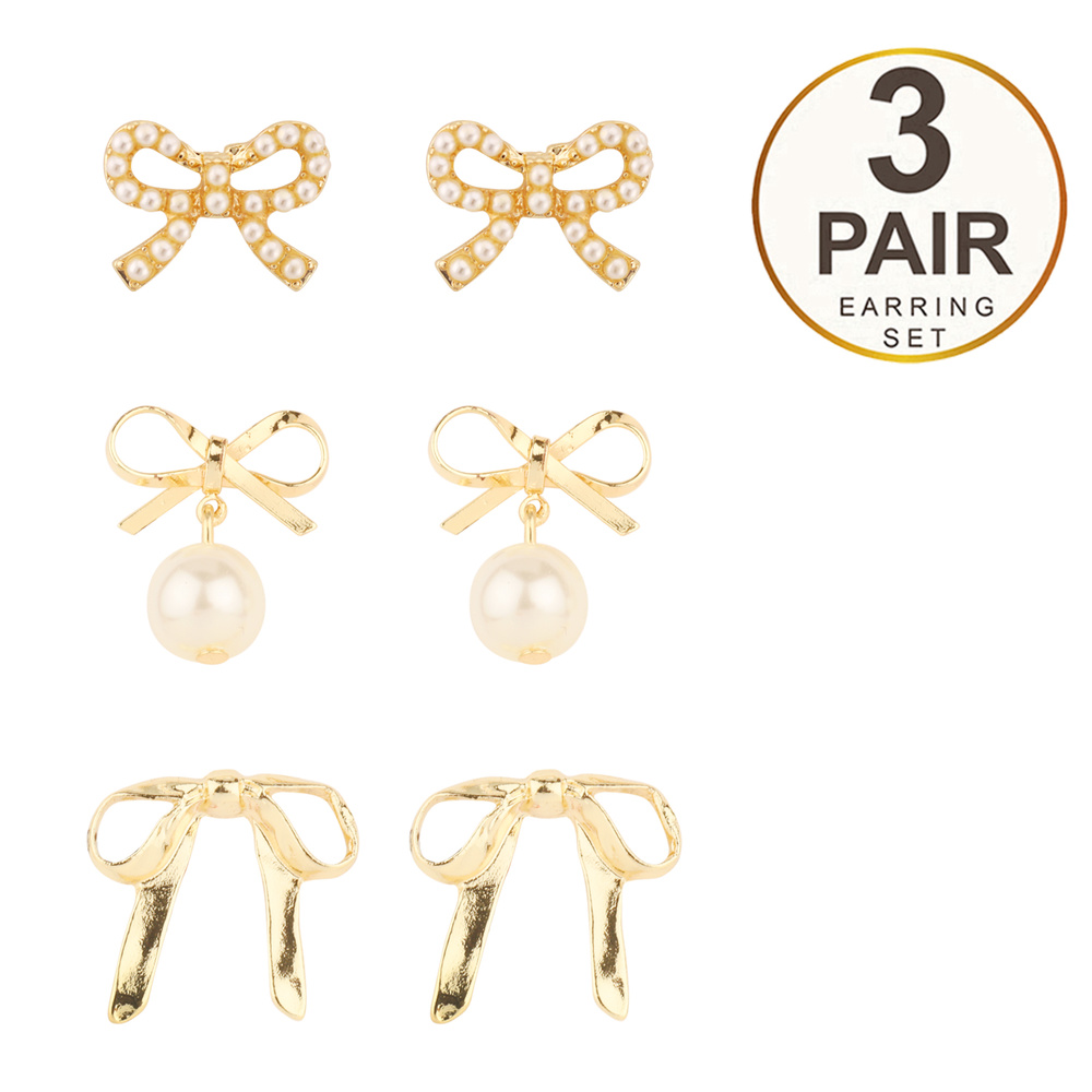 PEARL EMBELLISHED LONG TAIL BOW POST EARRING SET WITH IN GOLD TONE METAL
