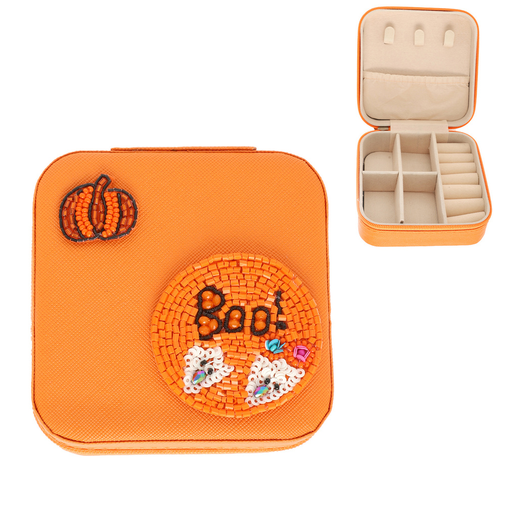 PUMPKIN "BOO" BEAD EMBROIDERED TRAVEL JEWELRY BOX WITH MULTIPULE COMPARTMENTS