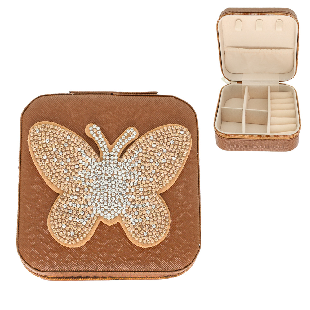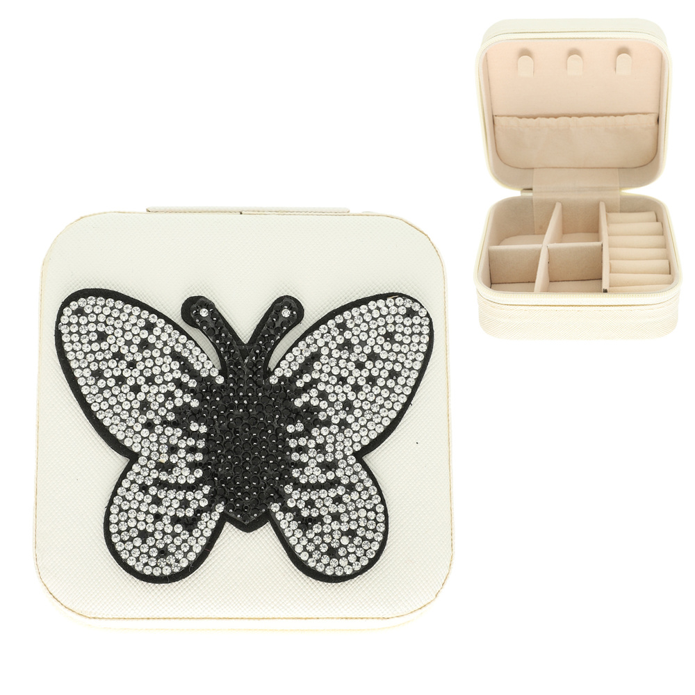 BUTTERFLY RHINESTONE EMBELLISHED TRAVEL JEWELRY BOX WITH MULTIPULE COMPARTMENTS