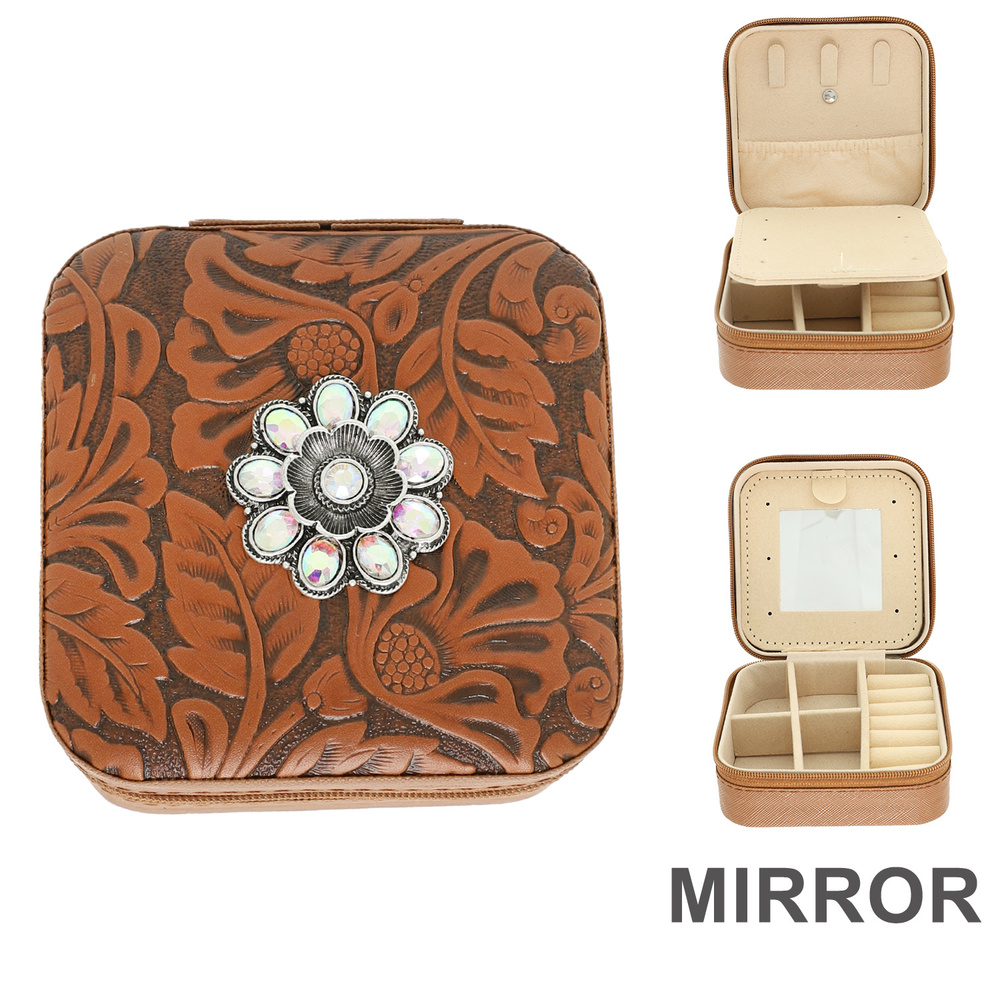 FLOWER CRYSTAL CONCHO FASTENED TOOLED LEATHER TRAVEL JEWELRY BOX WITH MIRROR