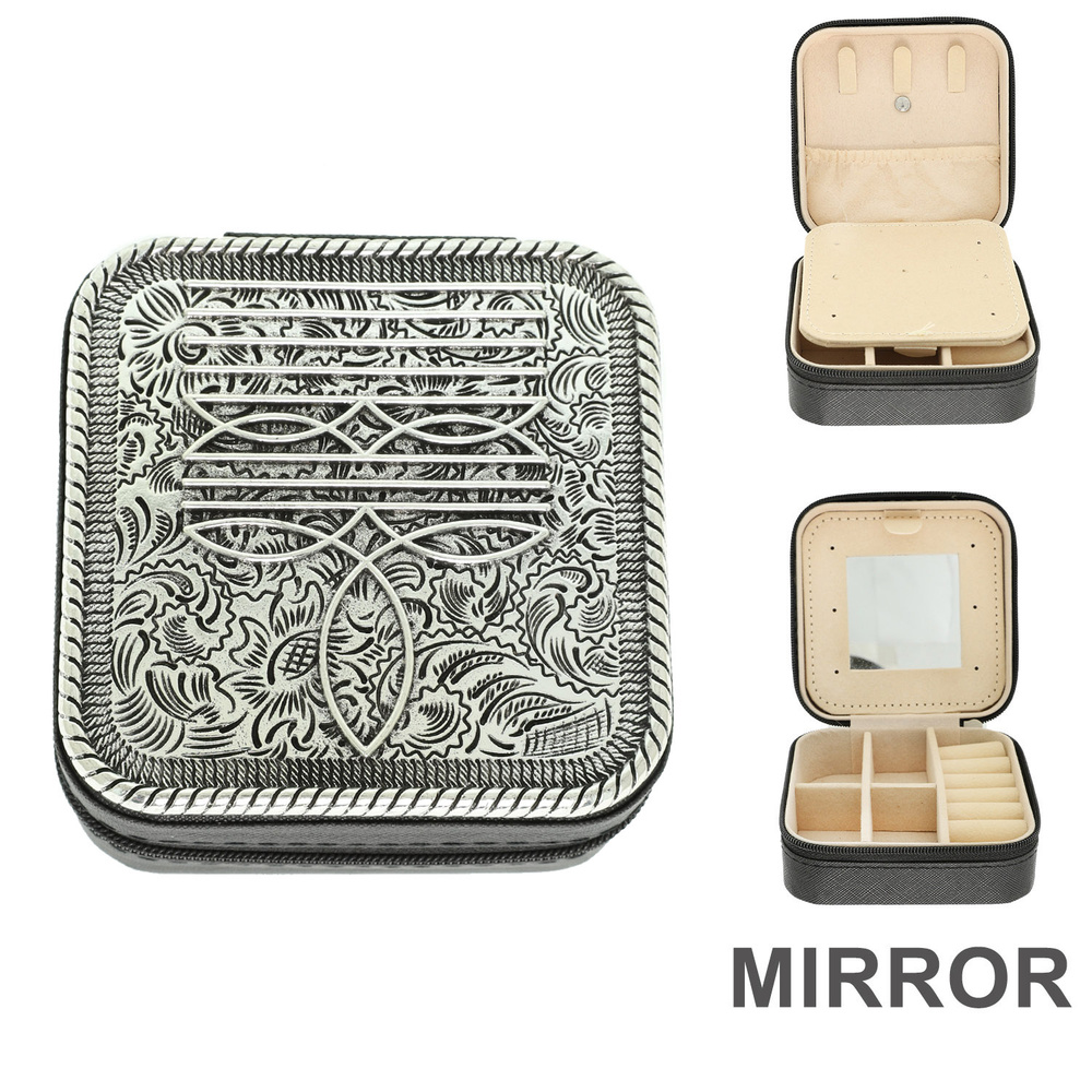FILIGREE SCROLL BOOT STITCH METAL PLATE TRAVEL JEWELRY BOX WITH MULTIPULE COMPARTMENTS