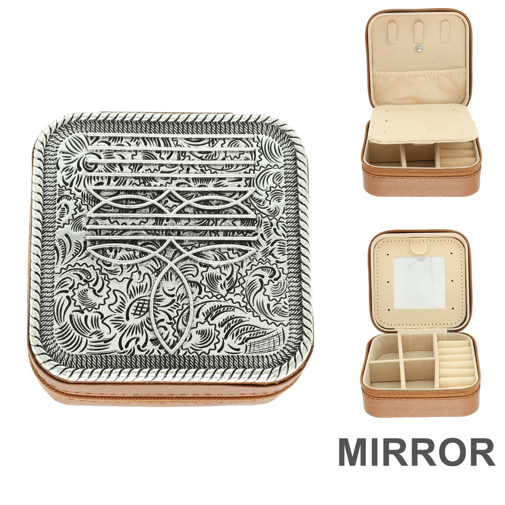 FILIGREE SCROLL BOOT STITCH METAL PLATE TRAVEL JEWELRY BOX WITH MULTIPULE COMPARTMENTS