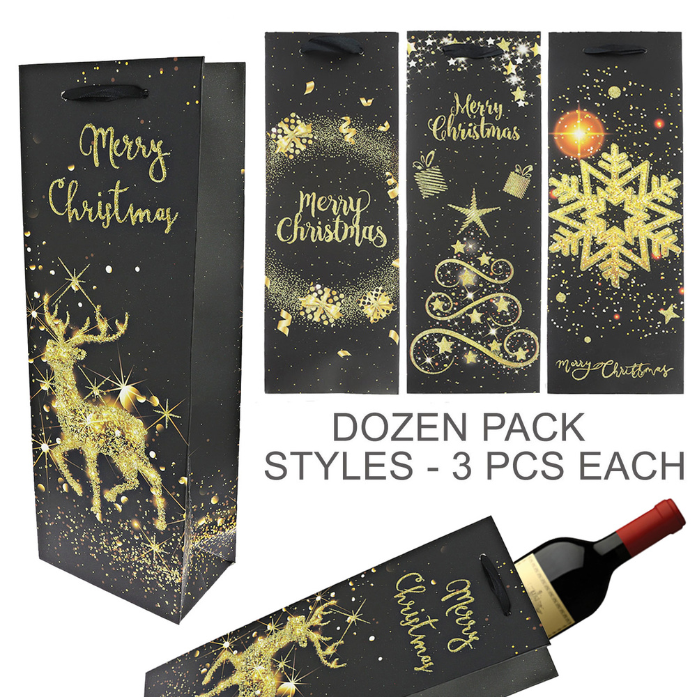 MERRY CHRISTMAS/ REINDEER/ XMAS TREE/ SNOWFLAKE- 12 PACK- 4 STYLES- 3PCS EACH-GOLD GLITTER ASSORTED VINTAGE CHRISTMAS THEMED WINE BOTTLE PAPER GIFT BAGS