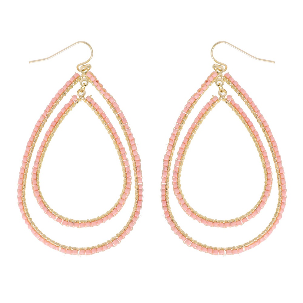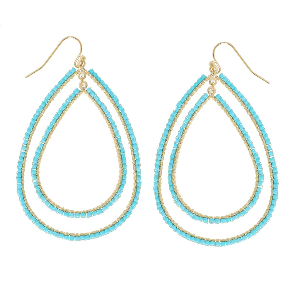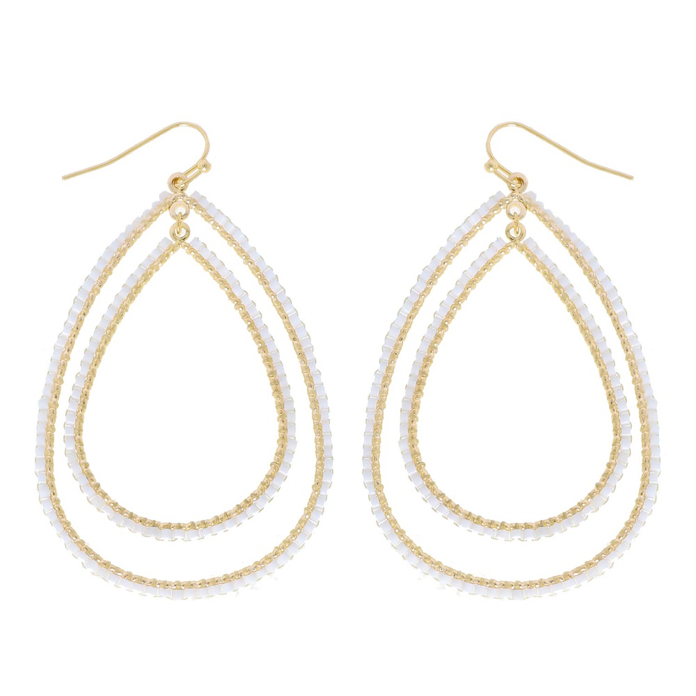 Double Open Teardrop Beaded Hook Earrings In Gold Tone Metal