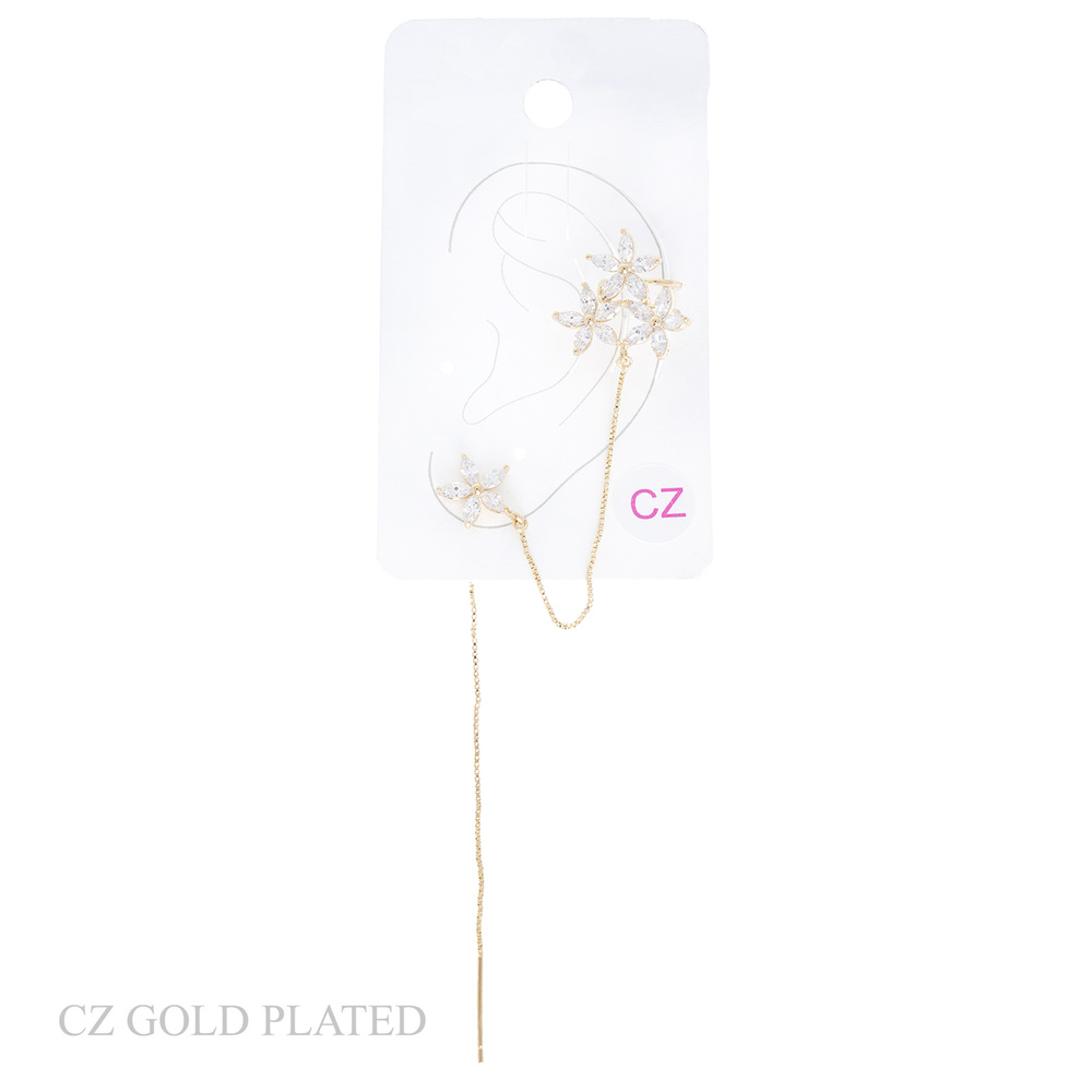 FLORAL GOLD PLATED CUBIC ZIRCONIA MARQUISE STUD CHAIN EAR CUFF EARRINGS IN YELLOW GOLD PLATTING