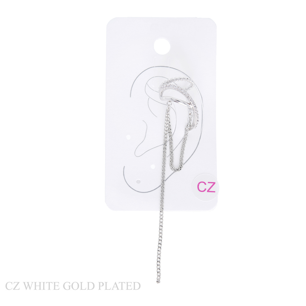 CRISS CROSS GOLD PLATED CUBIC ZIRCONIA DANGLE CHAIN EAR CUFF EARRINGS IN WHITE GOLD PLATTING