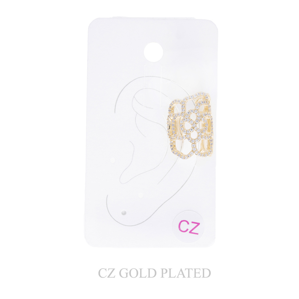 GOLD PLATED CUBIC ZIRCONIA FLORAL FILIGREE WIDE EAR CUFF EARRINGS IN YELLOW GOLD PLATTING